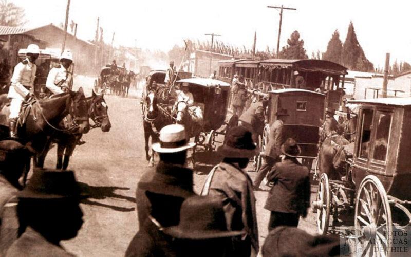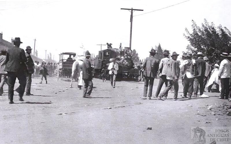 Locomotora de la Braden Cooper Company proveniente de la ciudad minera Sewell, llegando a Avenida Capitán Antonio Millán en la