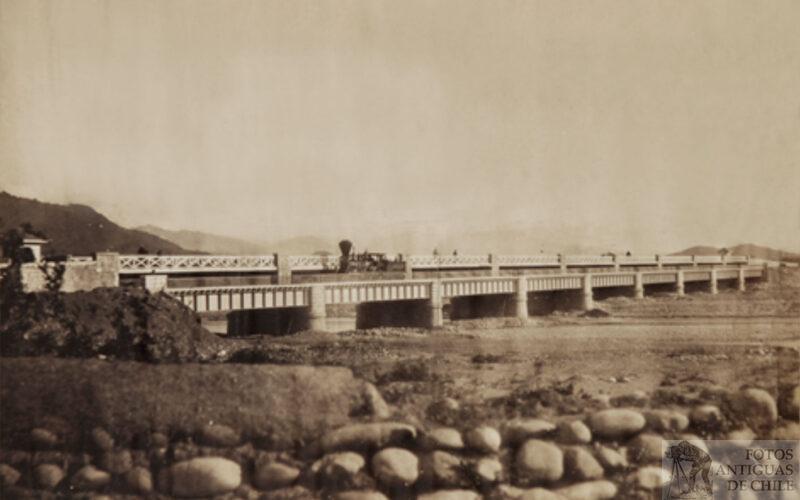 Locomotora y personas cruzando el puente Cachapoal en la región de O’Higgins. Fotografía del año 1862.