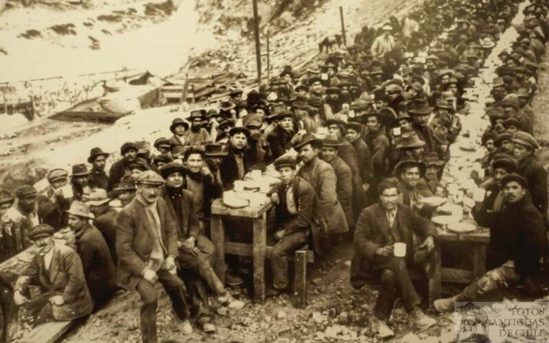 Trabajadores del campo minero Sewell en su hora de colación, año1920