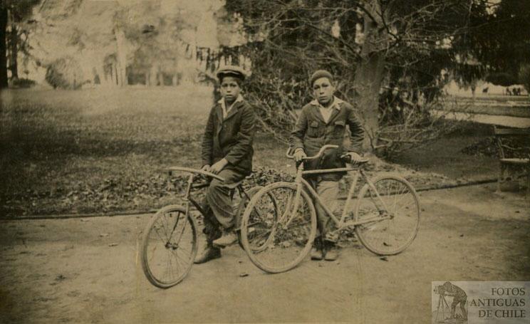 Dos niños en sus bicicletas posando para la foto en el Parque Quinta Normal.Santiago de Chile, año 1930