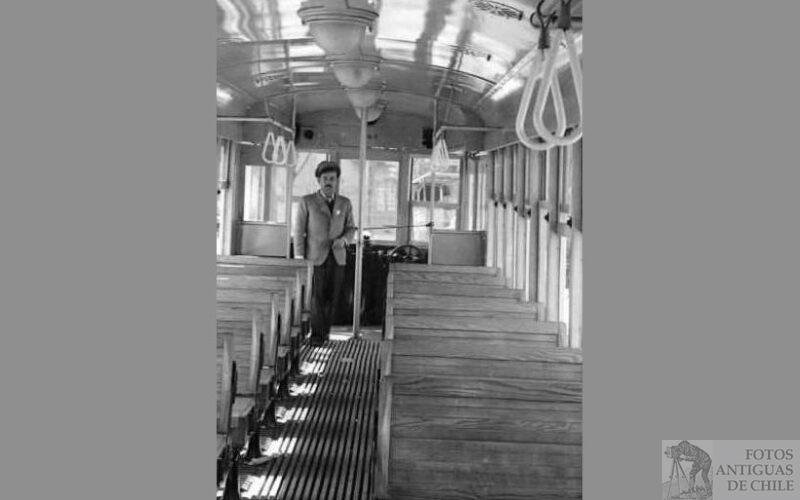 Interior de un tranvía y su conductor, Santiago de Chile, año 1935.