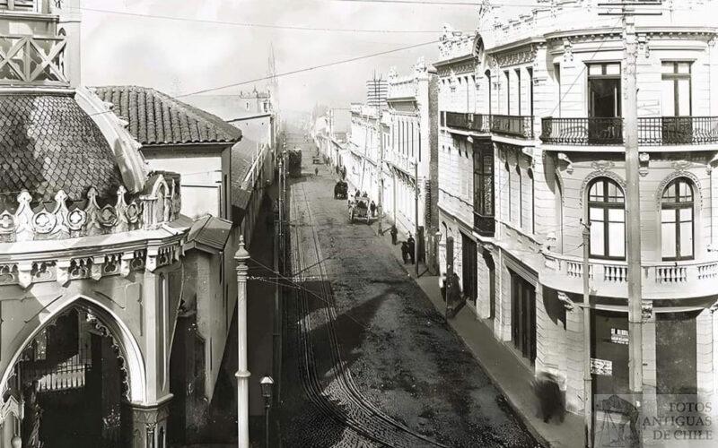 Vista desde la Alameda hacia calle Carmen, a la izquierda Iglesia de El Carmen Alto, Santiago 1910.